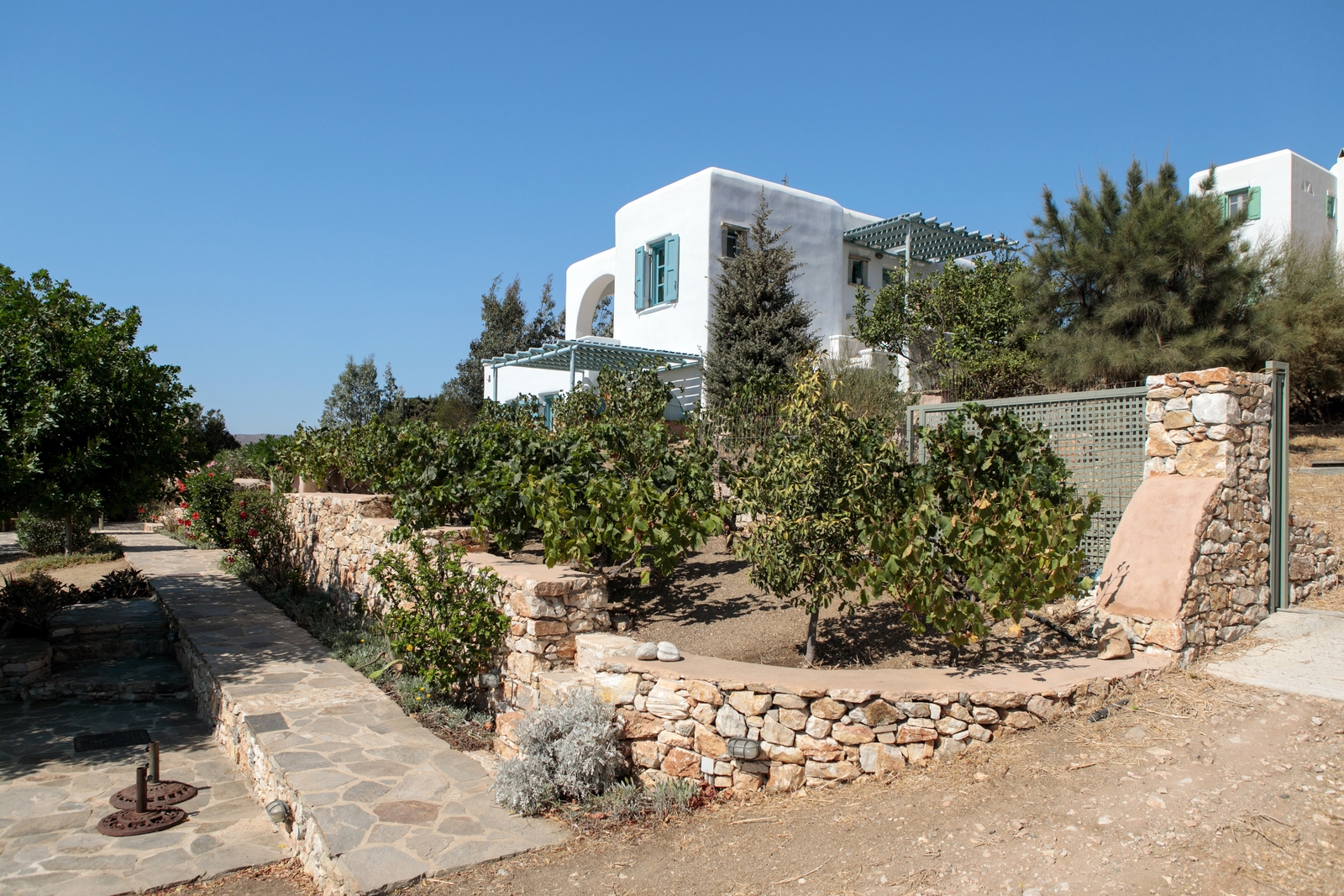 The off-white unit consists of two houses that combine the traditional Cycladic style with modern comforts. Built on a hill with unobstructed views, in a unique surrounding area with squares, stone living rooms, pergolas, dining rooms, BBQ and stone oven.