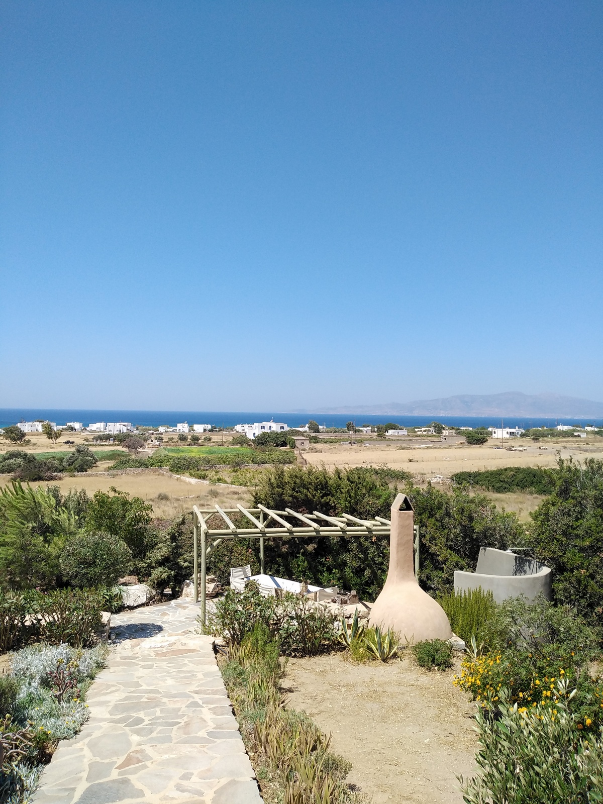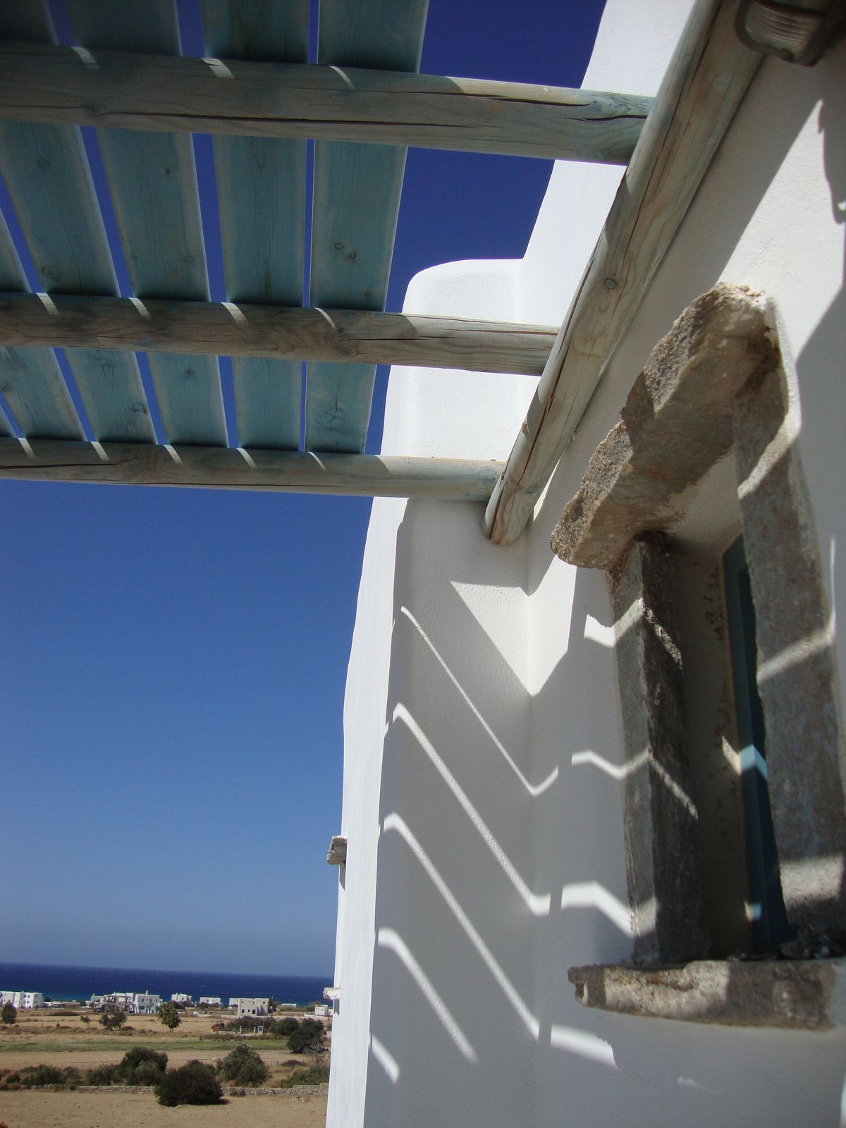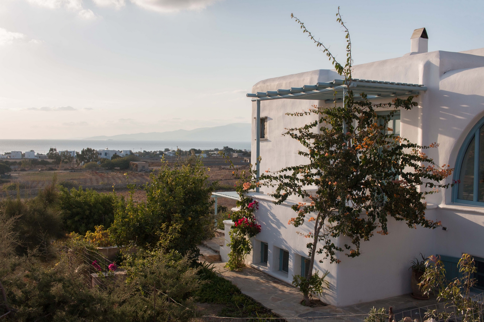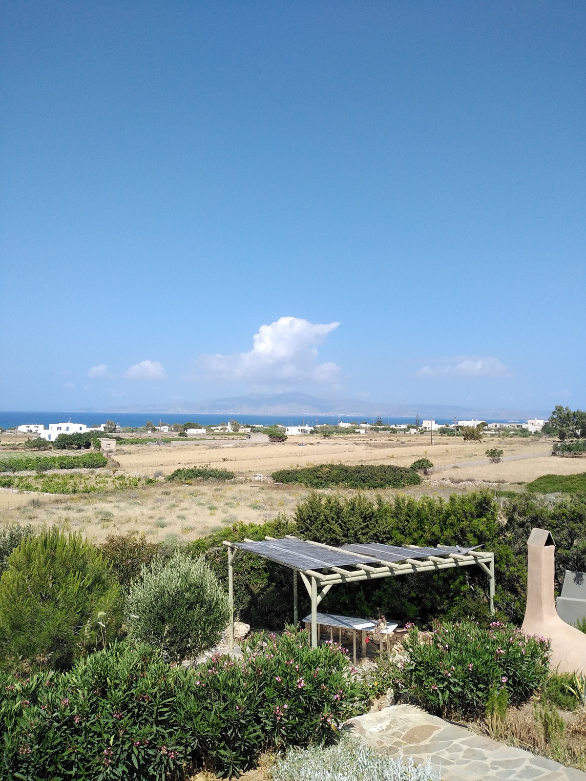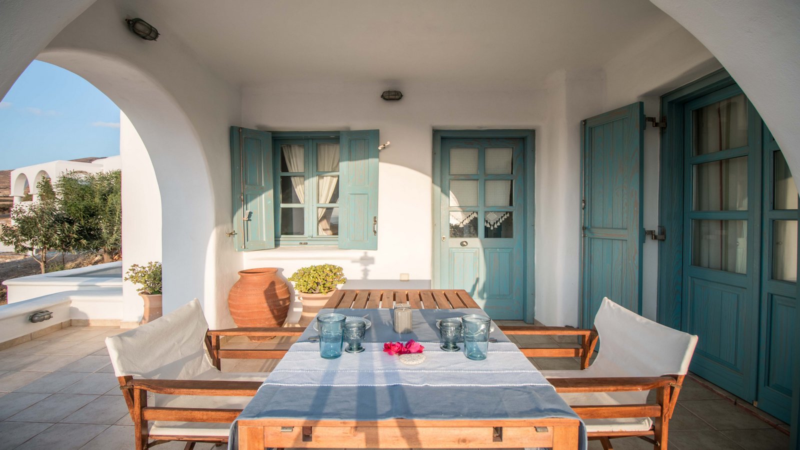 The off-white unit consists of two houses that combine the traditional Cycladic style with modern comforts. Built on a hill with unobstructed views, in a unique surrounding area with squares, stone living rooms, pergolas, dining rooms, BBQ and stone oven.