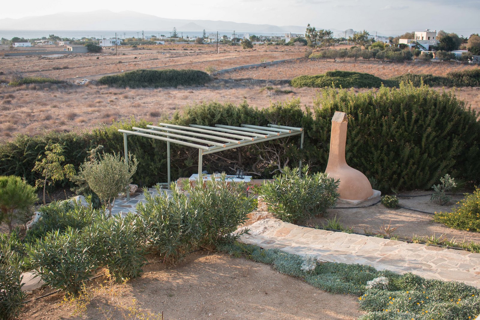 It is surrounded by a garden with trees and plants of local vegetation, table grape vineyard, vegetable garden and aloe flower beds.