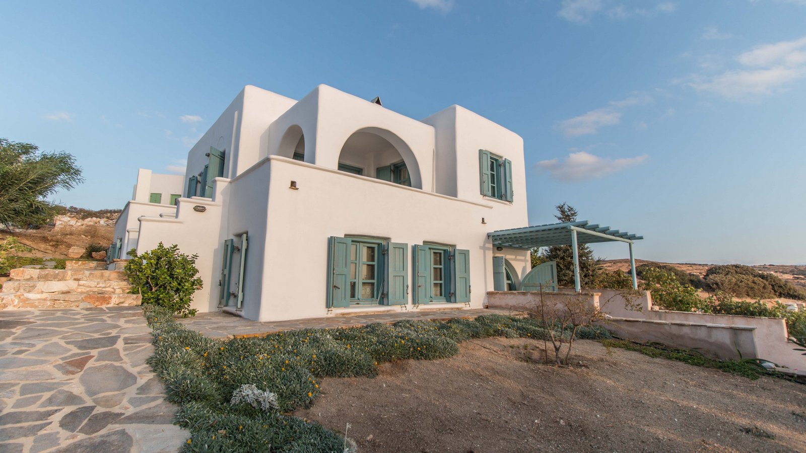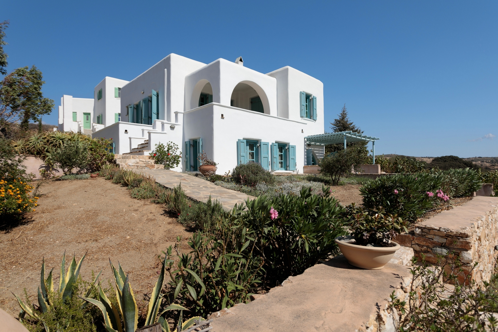 The off-white unit consists of two houses that combine the traditional Cycladic style with modern comforts. Built on a hill with unobstructed views, in a unique surrounding area with squares, stone living rooms, pergolas, dining rooms, BBQ and stone oven.
